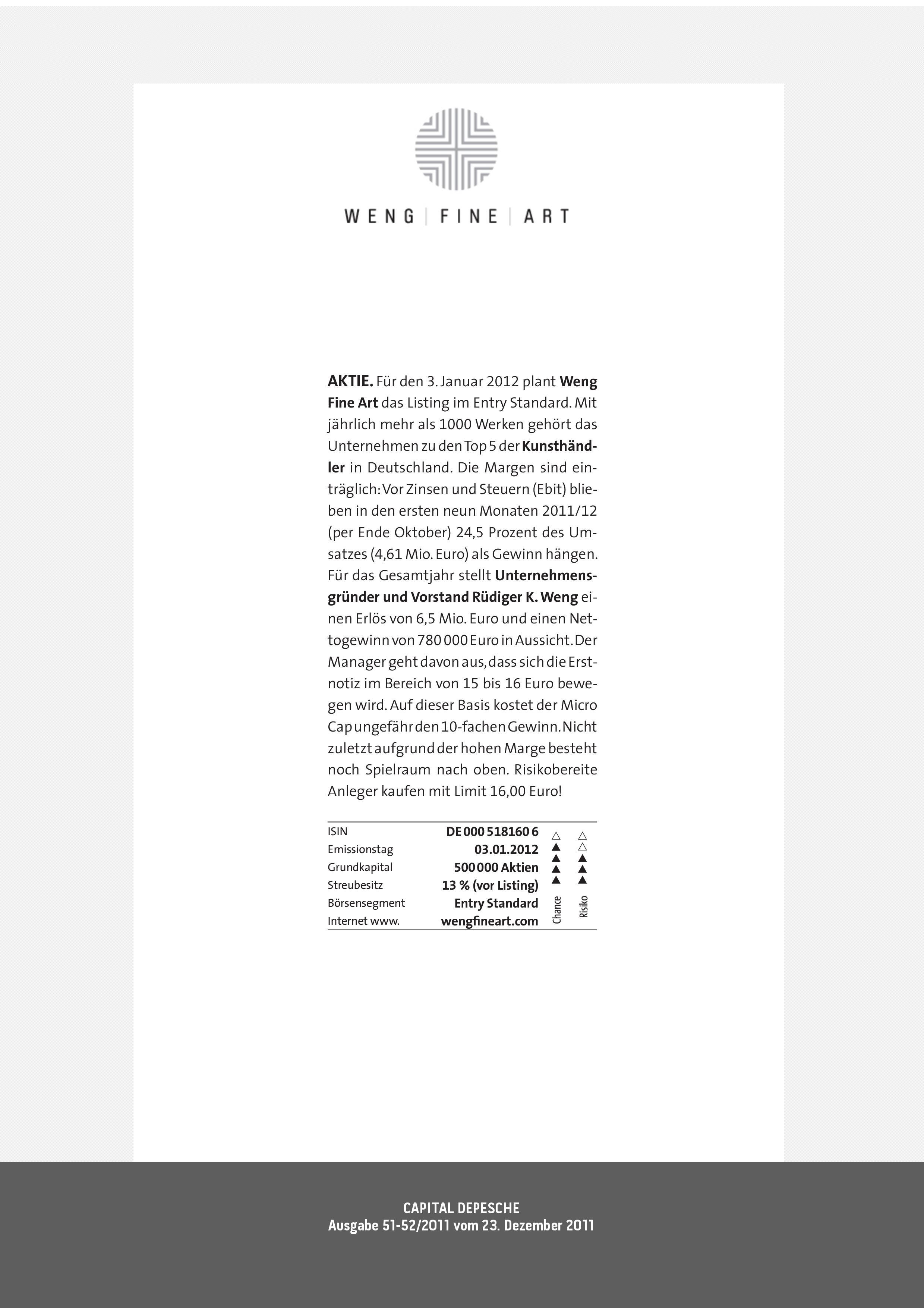 AKTIE. Für den 3. Januar 2012 plant Weng Fine Art das Listing im Entry Standard